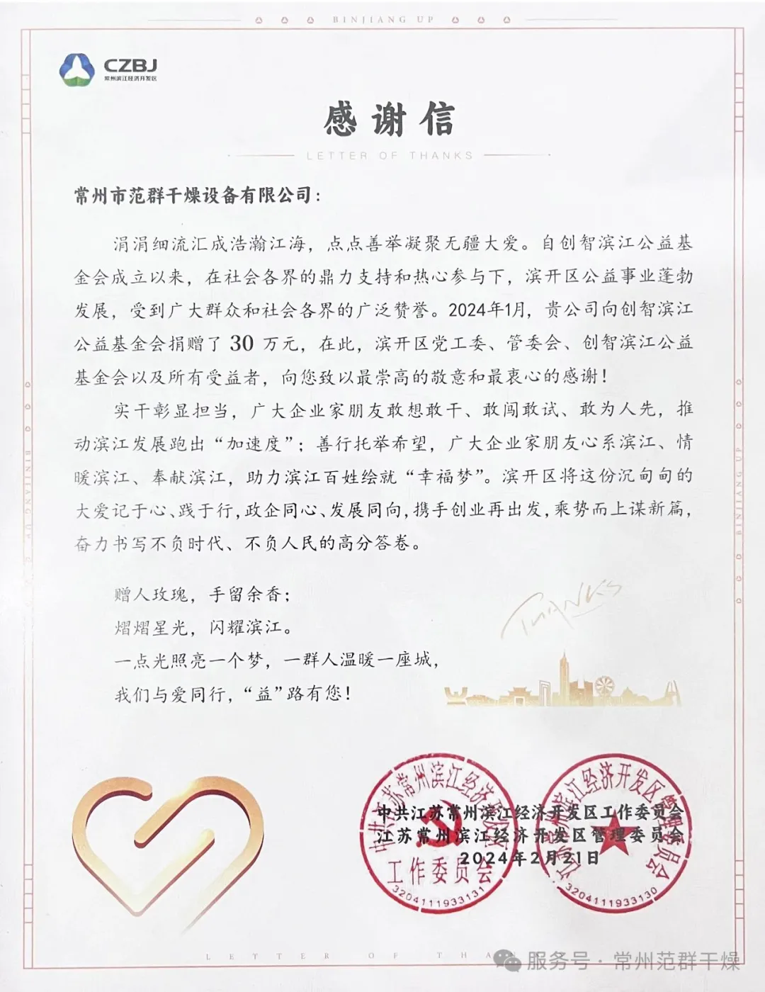 近日,常州市范群干燥設(shè)備有限公司向創(chuàng)智濱江公益基金會捐贈30萬元,以實際行動支持濱開區(qū)公益事業(yè)發(fā)展,用愛心善舉踐行企業(yè)社會責任,為區(qū)域公益事業(yè)注入溫暖力量。